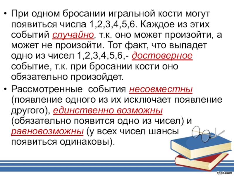 Некоторое событие (А,В,С,..) называют случайным по отношению к данному опыту, если при осуществлении этого опыта оно либо происходит , либо не происходит.