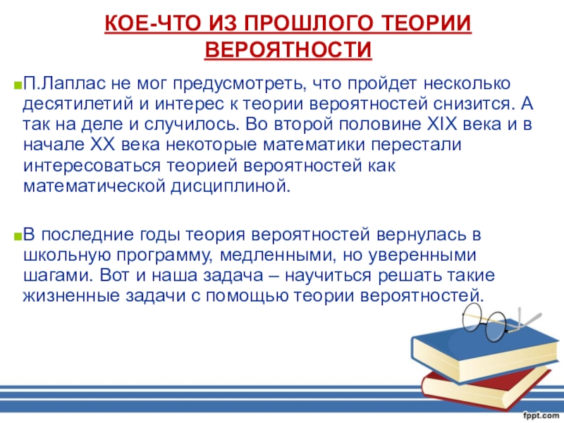 Впервые основы теории вероятностей были изложены последовательно французским математиком П.Лапласом (1749-1827) в книге «Аналитическая теория вероятностей».