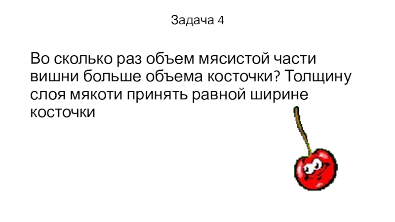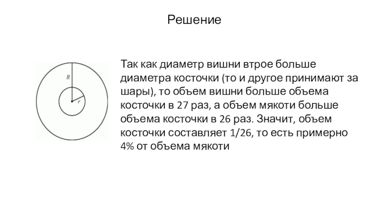 принимают за шары), то объем вишни больше объема косточки в 27 раз, а объем мякоти больше объема косточки в 26 раз. Значит, объем косточки составляет 1/26, то есть примерно 4% от объема мякоти