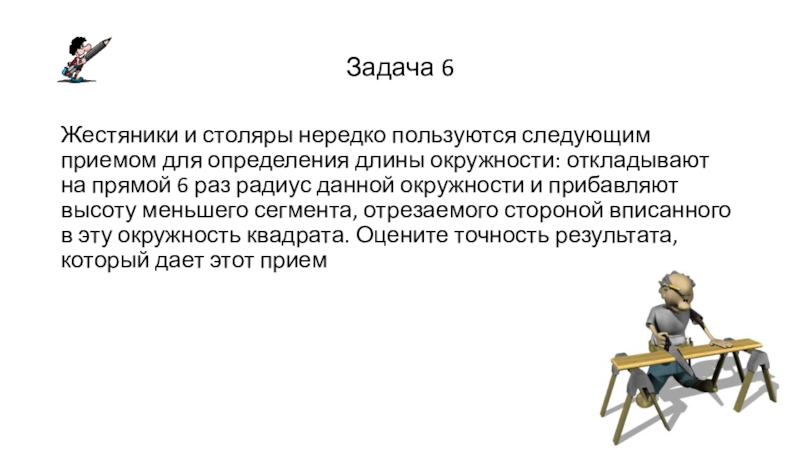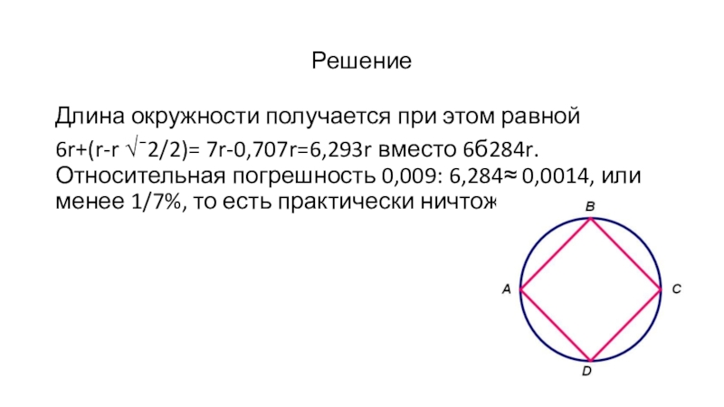 окружности: откладывают на прямой 6 раз радиус данной окружности и прибавляют высоту меньшего сегмента, отрезаемого стороной вписанного в эту окружность квадрата. Оцените точность результата, который дает этот прием