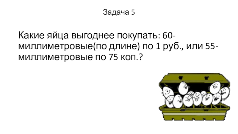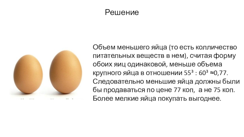 форму обоих яиц одинаковой, меньше объема крупного яйца в отношении 55³ : 60³ ≈0,77. Следовательно меньшие яйца должны были бы продаваться по цене 77 коп, а не 75 коп. Более мелкие яйца покупать выгоднее.