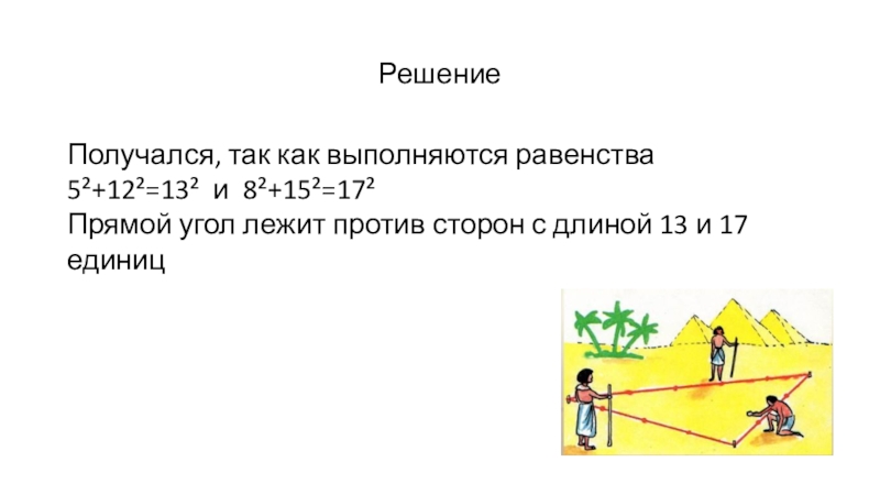 земле треугольник с соотношением сторон 5:12:13 или 8:15:17. Получался ли при этом прямой угол и если да, то против какой стороны?