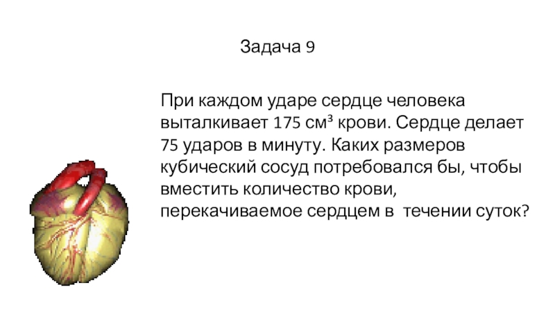 делает 75 ударов в минуту. Каких размеров кубический сосуд потребовался бы, чтобы вместить количество крови, перекачиваемое сердцем в течении суток?