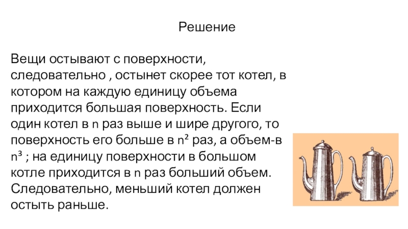 котором на каждую единицу объема приходится большая поверхность. Если один котел в n раз выше и шире другого, то поверхность его больше в n² раз, а объем-в n³ ; на единицу поверхности в большом котле приходится в n раз больший объем. Следовательно, меньший котел должен остыть раньше.