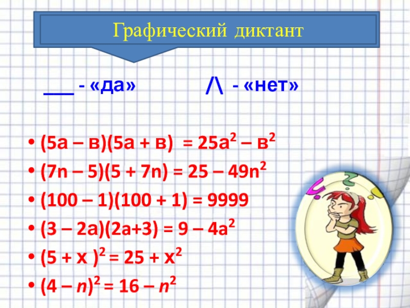 е) (7 + 3у)(3у – 7) = (3у)2 – (7)2 = 9у2 – 49;