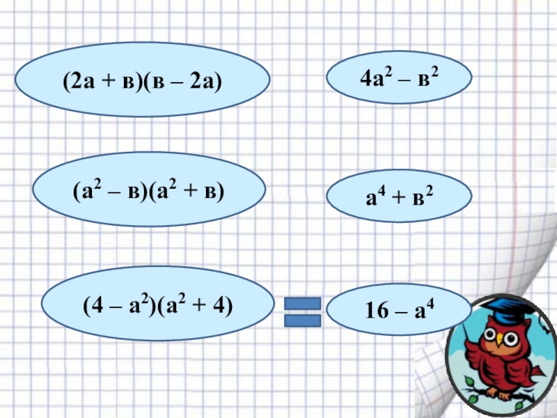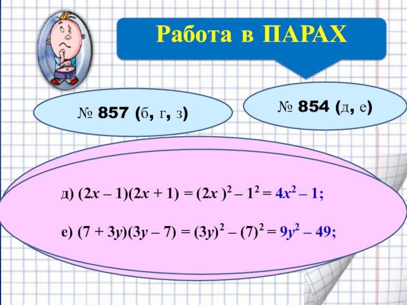 д) (2х – 1)(2х + 1) = (2х )2 – 12 = 4х2 – 1;