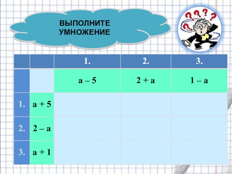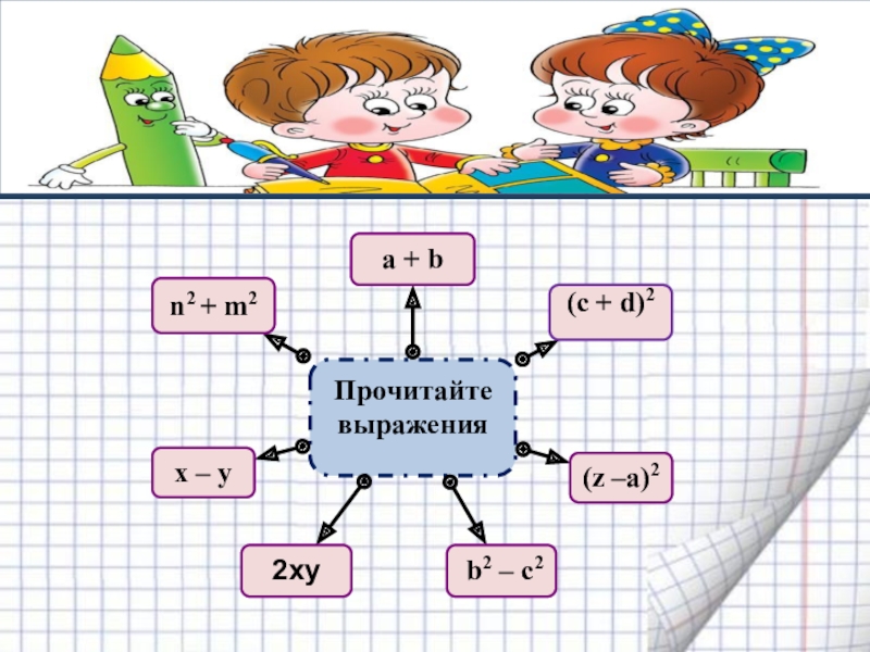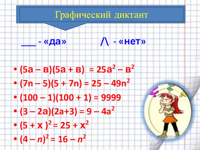 Физкультминутка9 – 4a2(4 – n)2 7а + 10 + а2(5 + х )2 25 – х2 4а2 – в2