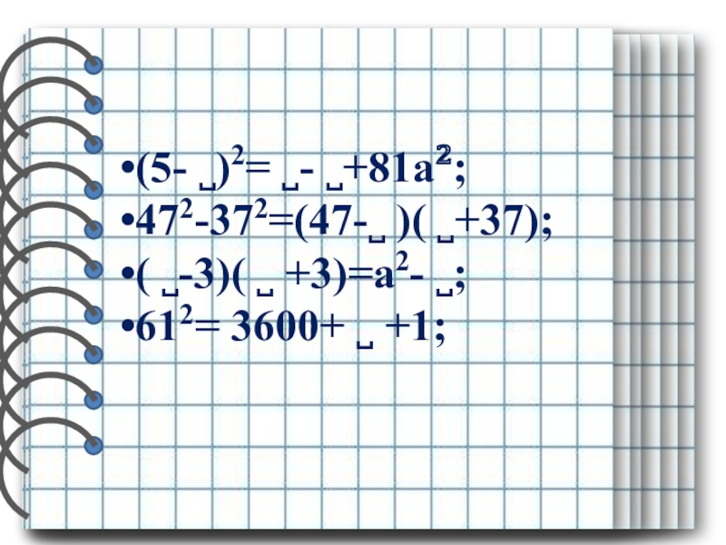 (5- ˽)2= ˽- ˽+81a²;472-372=(47-˽ )( ˽+37);( ˽-3)( ˽ +3)=a2- ˽;612= 3600+ ˽ +1;
