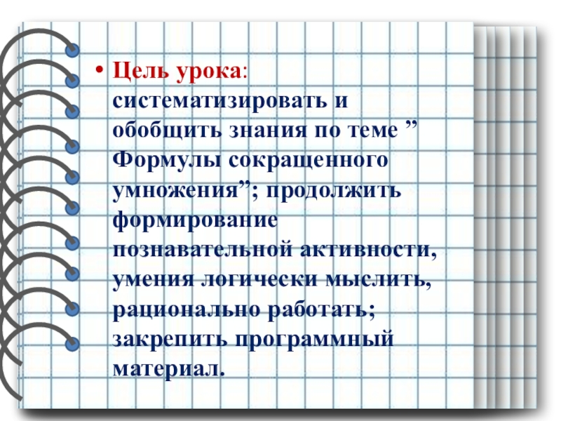 Слайд 5Цель урока: систематизировать и обобщить знания по теме ”Формулы сокращенного умножения”;