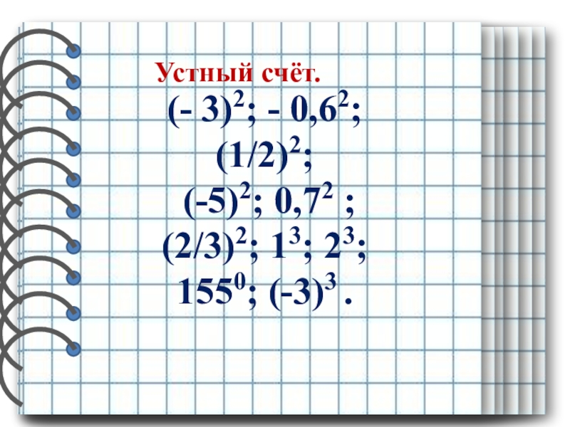 Устный счёт.(- 3)2; - 0,62; (1/2)2; (-5)2; 0,72 ; (2/3)2; 13; 23;1550; (-3)3 .