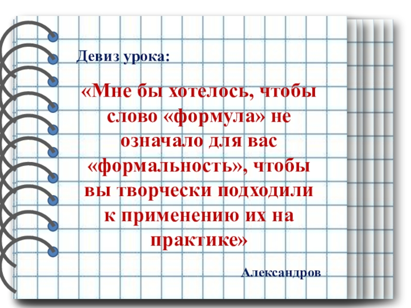 Девиз урока:«Мне бы хотелось, чтобы слово «формула» не означало для вас «формальность», чтобы вы творчески подходили к