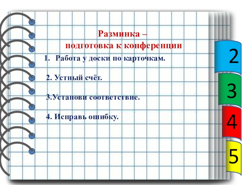 Разминка – подготовка к конференцииРабота у доски по карточкам.2. Устный счёт.3.Установи соответствие.4. Исправь ошибку.