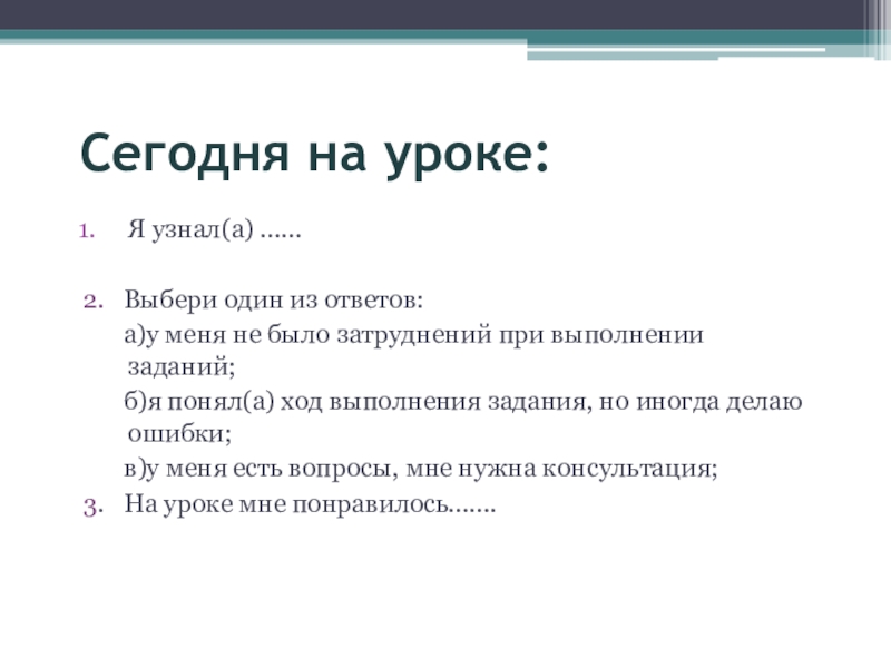 Сегодня на уроке:Я узнал(а) ……2.	Выбери один из ответов:	а)у меня не было затруднений при выполнении заданий;	б)я понял(а) ход