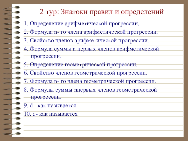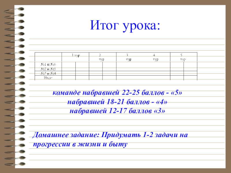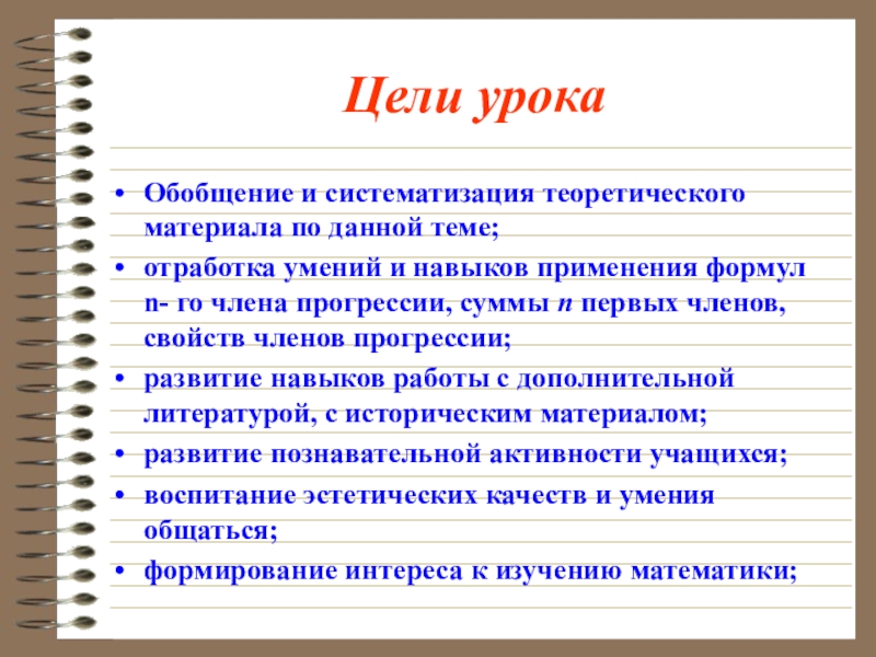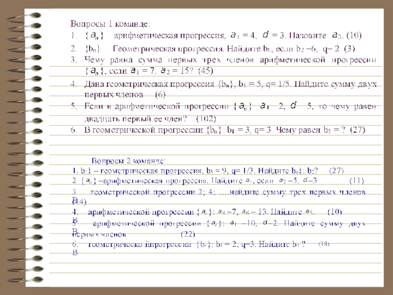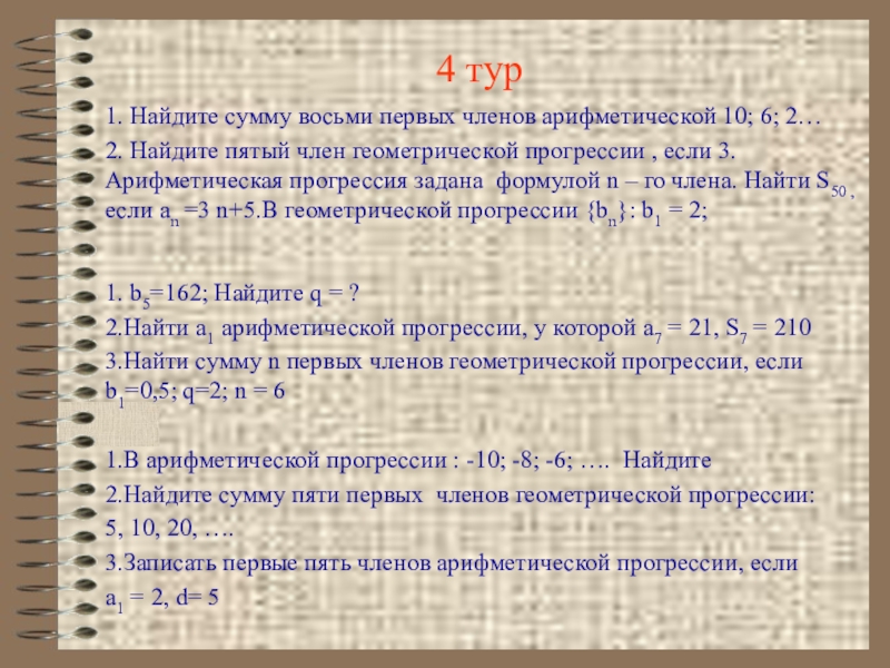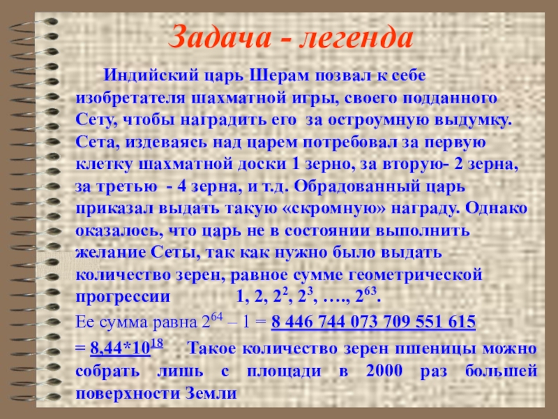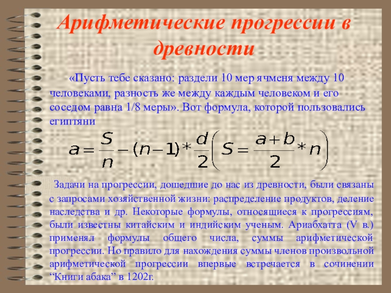Задачи на прогрессии, дошедшие до нас из древности, были связаны с запросами хозяйственной жизни: распределение продуктов, деление наследства и др. Некоторые формулы, относящиеся к прогрессиям, были известны китайским и индийским ученым. Ариабхатта (V в.) применял формулы общего числа, суммы арифметической прогрессии. Но правило для нахождения суммы членов произвольной арифметической прогрессии впервые встречается в сочинении “Книги абака” в 1202г.