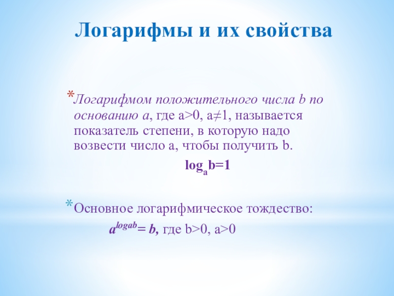 Логарифмы и их свойстваЛогарифмом положительного числа b по основанию a, где a>0, a≠1, называется показатель степени, в которую надо возвести число a, чтобы получить b. logab=1Основное логарифмическое тождество: alogab= b,
