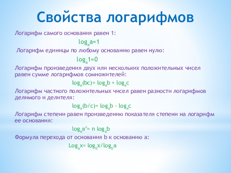 Свойства логарифмовЛогарифм самого основания равен 1: