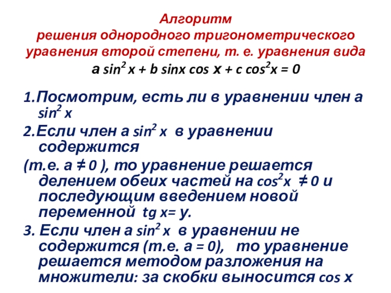 (т.е. а ≠ 0 ), то уравнение решается делением обеих частей на cos2x ≠ 0 и последующим введением новой переменной tg x= у.