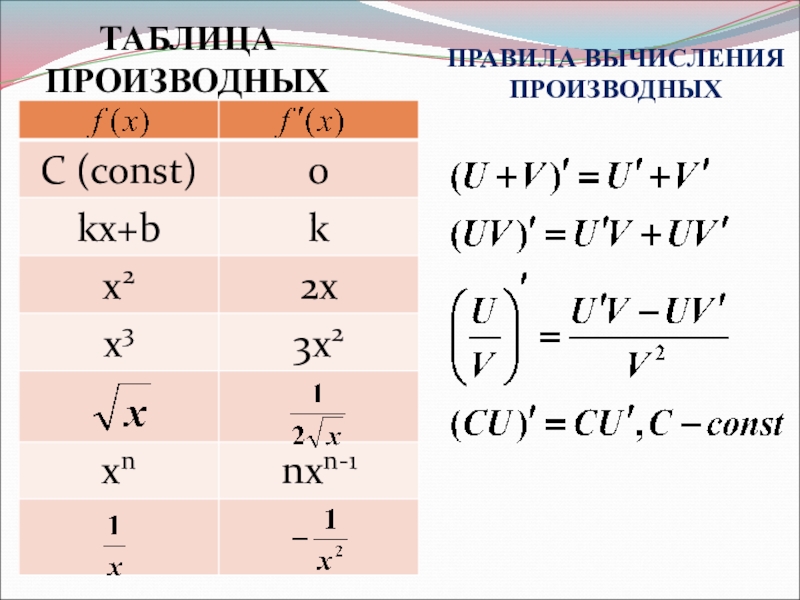 ТАБЛИЦА ПРОИЗВОДНЫХПРАВИЛА ВЫЧИСЛЕНИЯПРОИЗВОДНЫХ