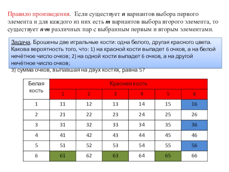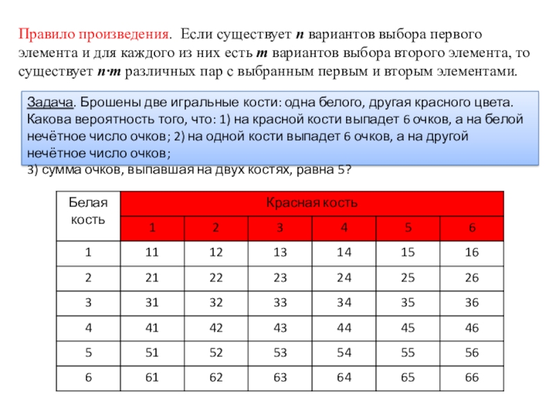 Задача. Брошены две игральные кости: одна белого, другая красного цвета. Какова вероятность того, что: 1) на красной кости выпадет 6 очков, а на белой нечётное число очков; 2) на одной кости выпадет 6 очков, а на другой нечётное число очков;
