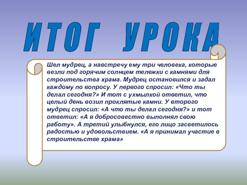Шел мудрец, а навстречу ему три человека, которые везли под горячим солнцем тележки с камнями для строительства храма. Мудрец остановился и задал каждому по вопросу. У первого спросил: «Что ты делал сегодня?» И тот с ухмылкой ответил, что целый день возил проклятые камни. У второго мудрец спросил: «А что ты делал сегодня?» и тот ответил: «А я добросовестно выполнял свою работу». А третий улыбнулся, его лицо засветилось радостью и удовольствием. «А я принимал участие в строительстве храма»