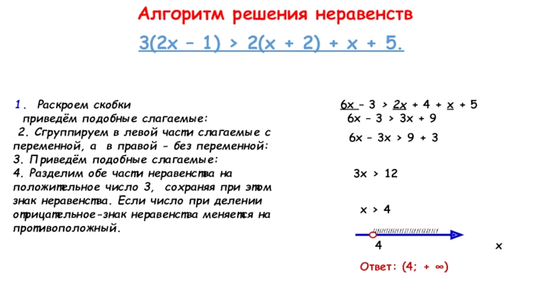 4. Разделим обе части неравенства на положительное число 3, сохраняя при этом знак неравенства. Если число при делении отрицательное-знак неравенства меняется на противоположный.