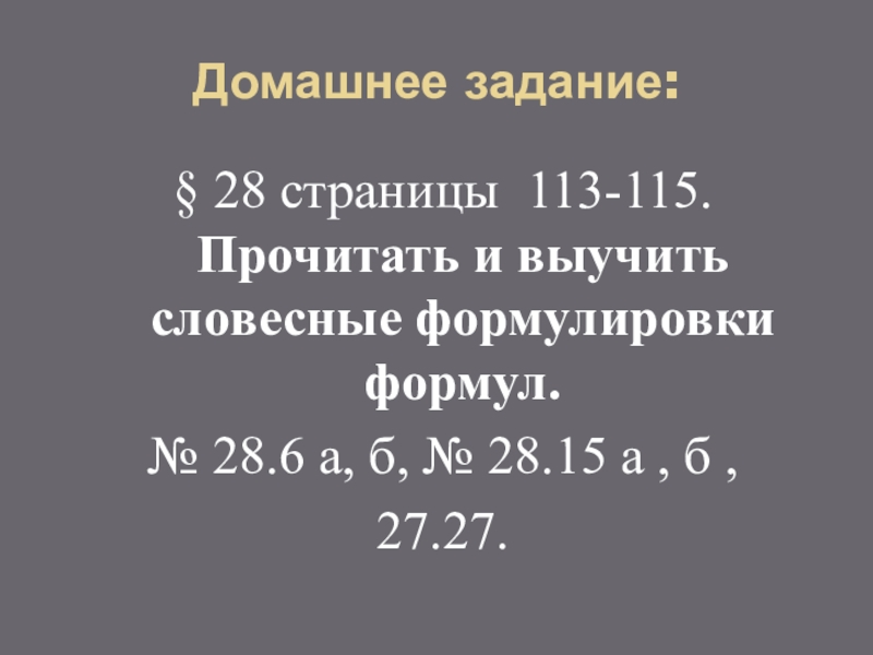 § 28 страницы 113-115. Прочитать и выучить словесные формулировки формул.