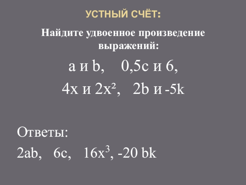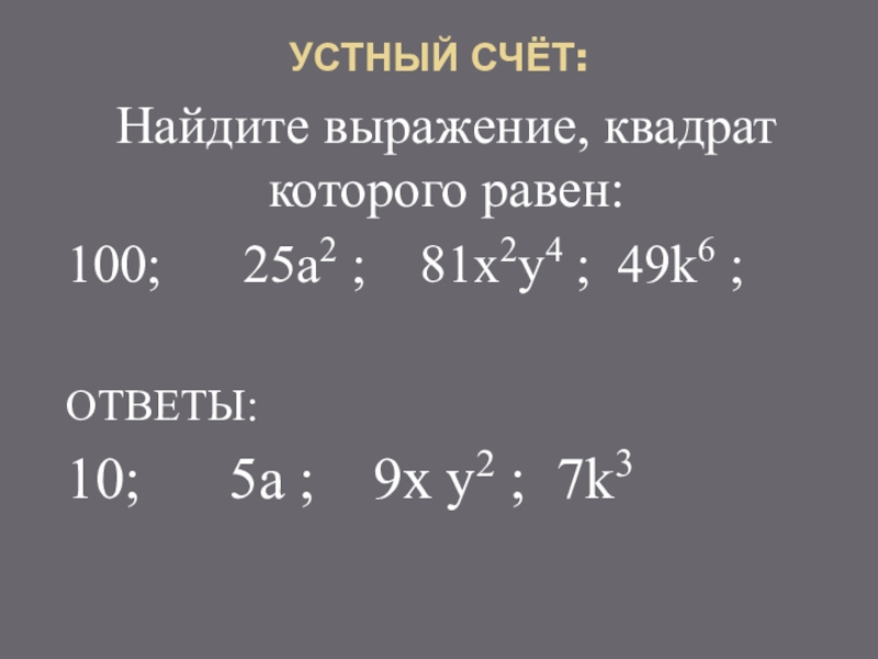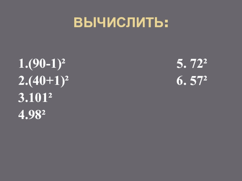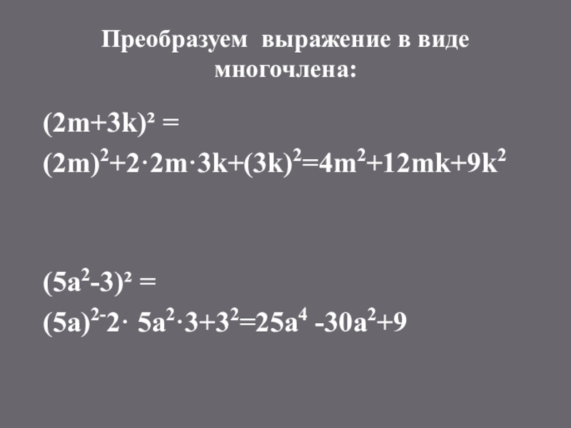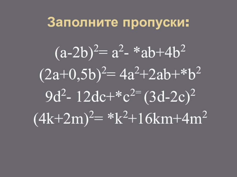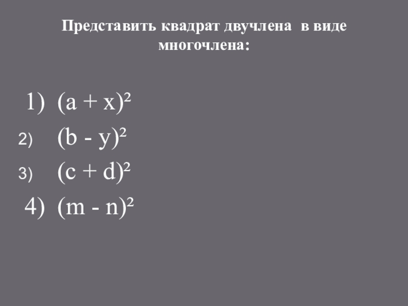 Слайд 17Представить квадрат двучлена в виде многочлена: