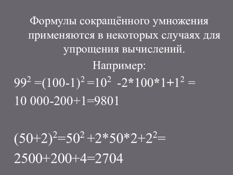 Слайд 14Формулы сокращённого умножения применяются в некоторых случаях для упрощения вычислений.