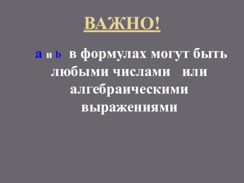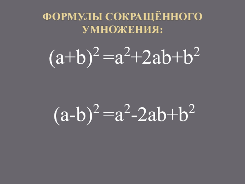 Слайд 13ФОРМУЛЫ СОКРАЩЁННОГО УМНОЖЕНИЯ: