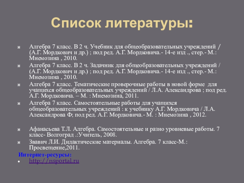 Звавич Л.И. Дидактические материалы. Алгебра. 7 класс-М.: Просвещение,2011.
