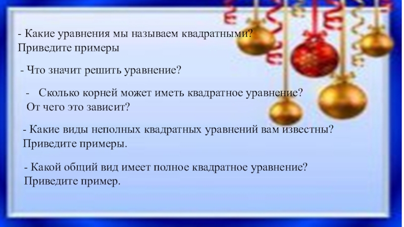 - Какие виды неполных квадратных уравнений вам известны? Приведите примеры.