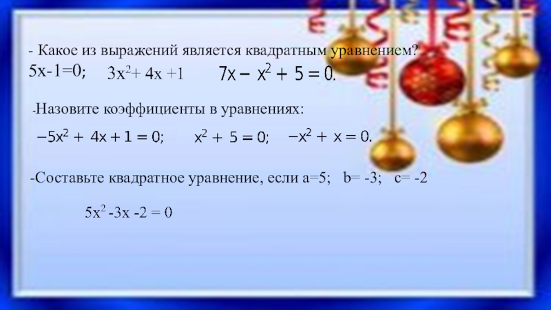 -Составьте квадратное уравнение, если a=5; b= -3; c= -2
