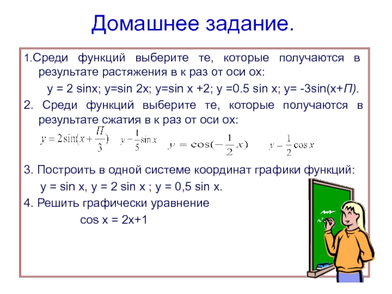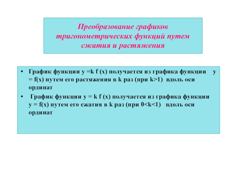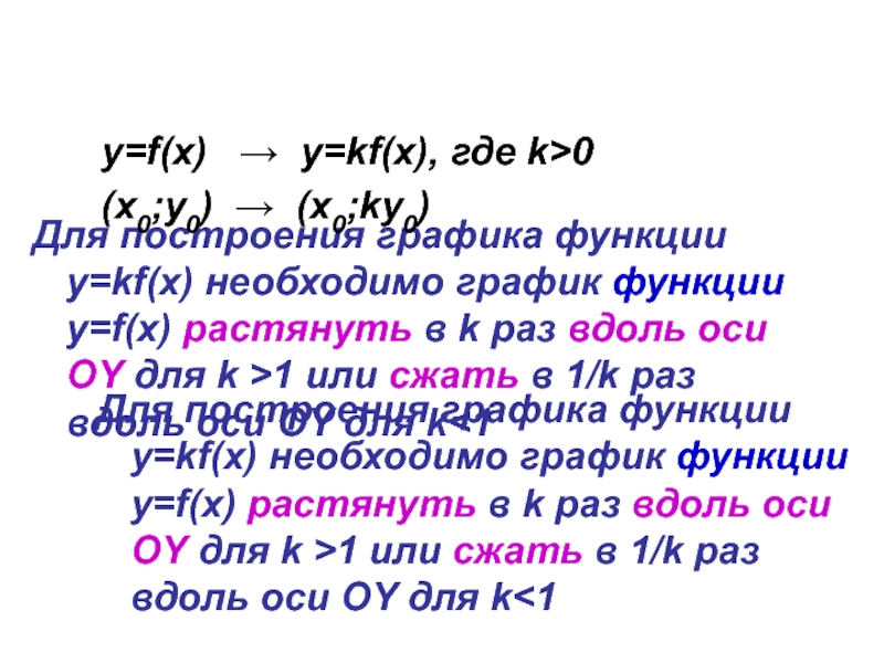 Для построения графика функции y=kf(x) необходимо график функции y=f(x) растянуть в k раз вдоль оси ОY для k >1 или сжать в 1/k раз вдоль оси OY для k<1