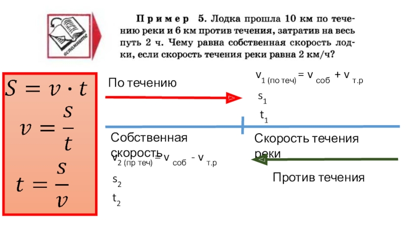 Собственная скоростьСкорость течения рекиПо течениюПротив теченияv1 (по теч) = v соб + v т.рt1s1v2 (пр теч) =