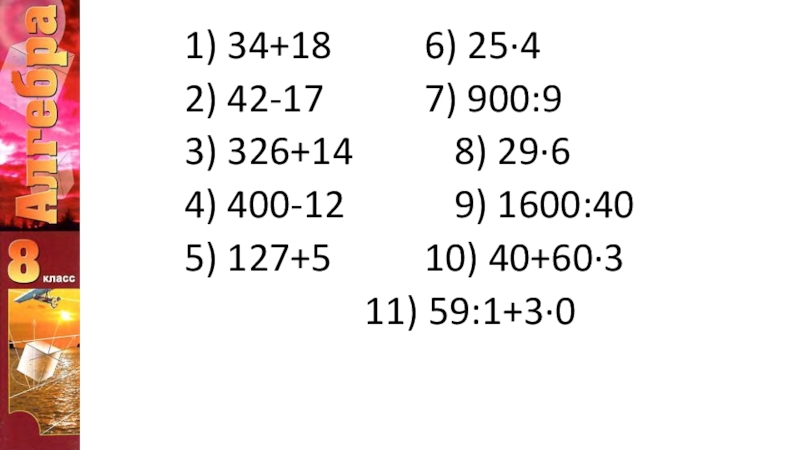 1) 34+18				6) 25∙42) 42-17				7) 900:93) 326+14				8) 29∙6 4) 400-12				9) 1600:405) 127+5				10) 40+60∙3						11) 59:1+3∙0