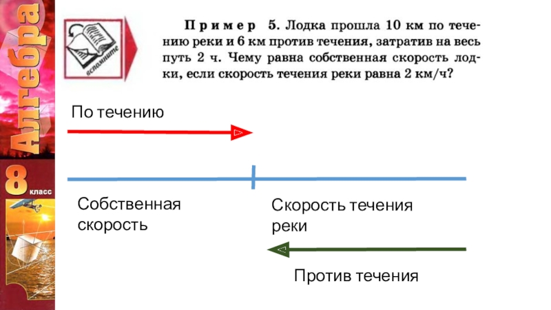 Собственная скоростьСкорость течения рекиПо течениюПротив течения