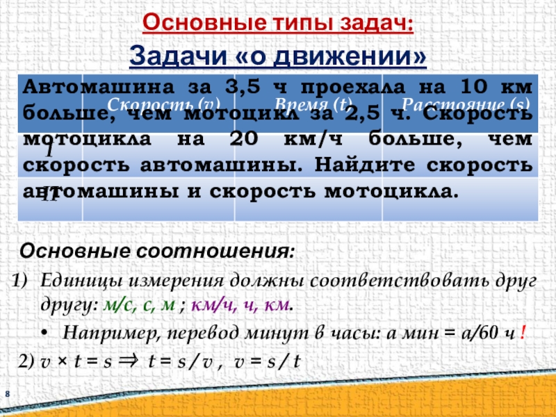 Автомашина за 3,5 ч проехала на 10 км больше, чем мотоцикл за 2,5 ч. Скорость мотоцикла на 20 км/ч больше, чем скорость автомашины. Найдите скорость автомашины и скорость мотоцикла.