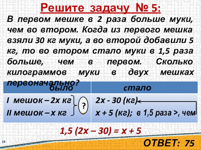 х кг х + 5 (кг); в 1,5 раза >, чем