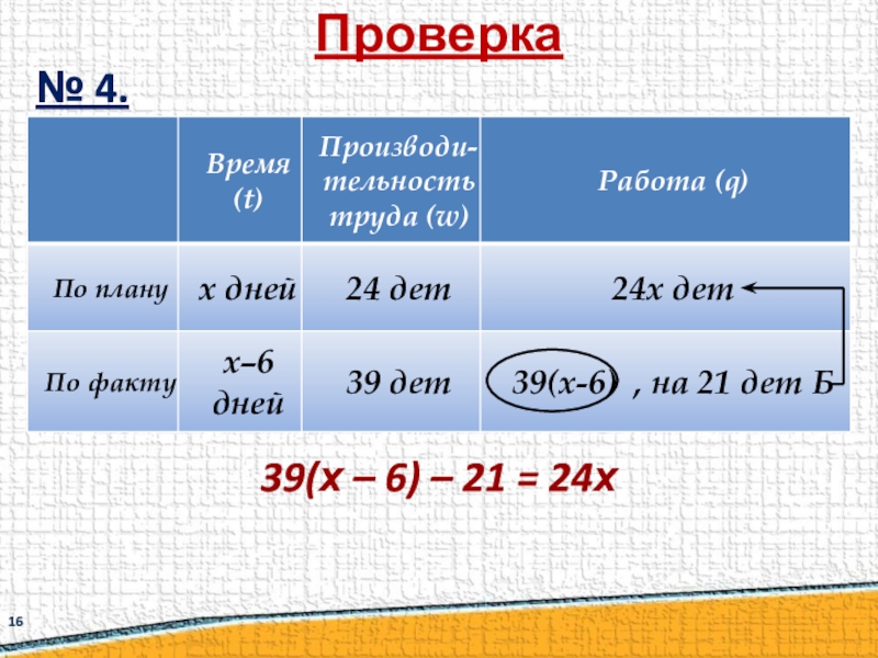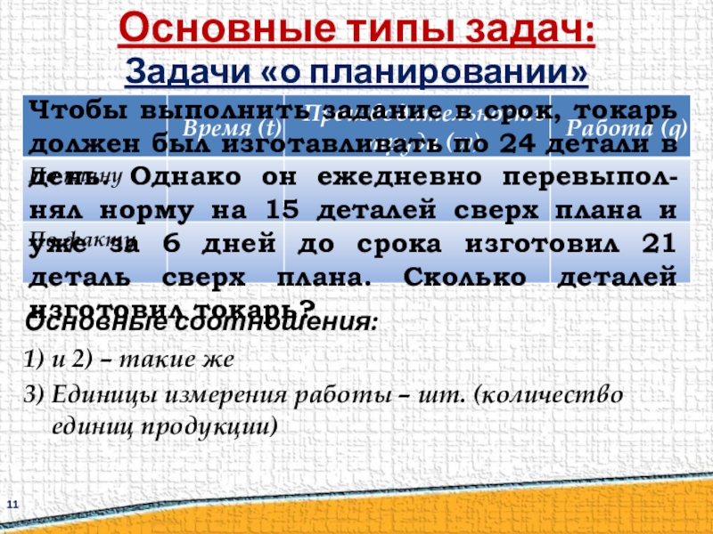 Чтобы выполнить задание в срок, токарь должен был изготавливать по 24 детали в день. Однако он ежедневно перевыпол-нял норму на 15 деталей сверх плана и уже за 6 дней до срока изготовил 21 деталь сверх плана. Сколько деталей изготовил токарь?