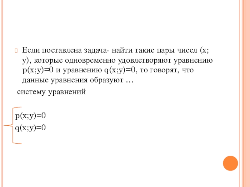 Если поставлена задача- найти такие пары чисел (х;у), которые одновременно удовлетворяют уравнению p(x;y)=0 и уравнению q(x;y)=0, то