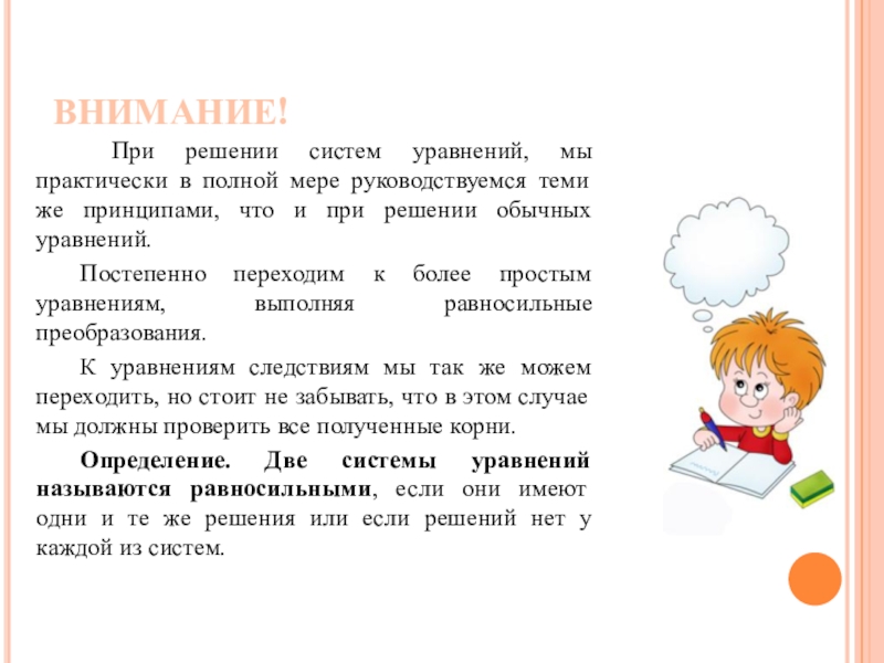 ВНИМАНИЕ!	 При решении систем уравнений, мы практически в полной мере руководствуемся теми же принципами, что и при