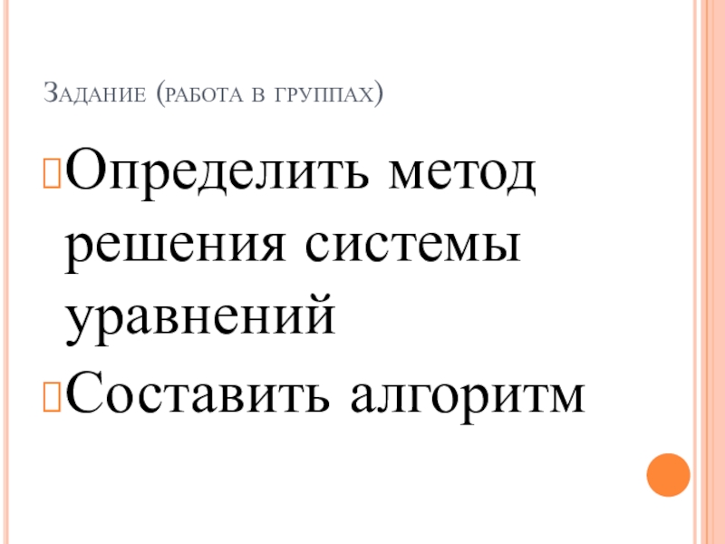 Задание (работа в группах)Определить метод решения системы уравненийСоставить алгоритм