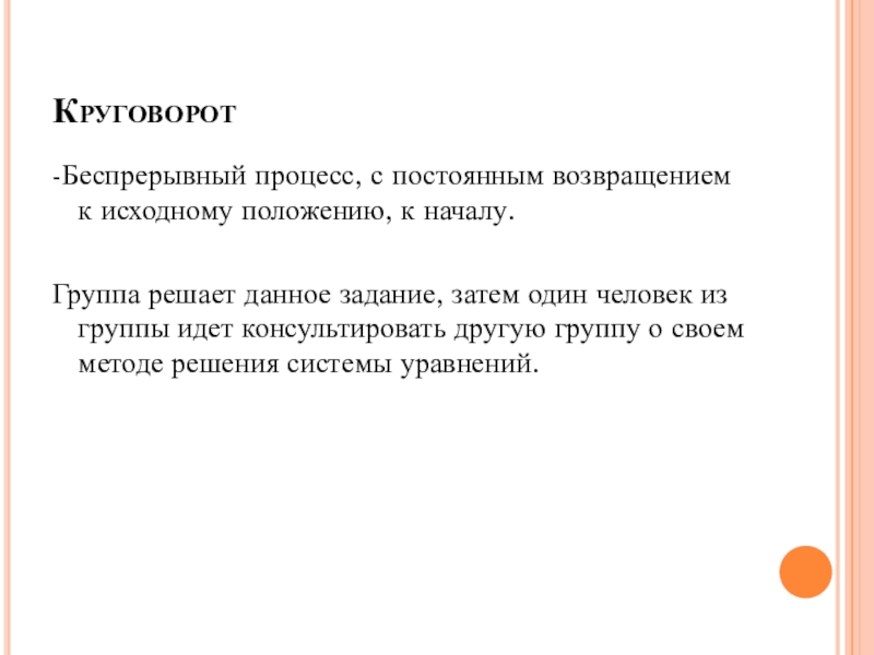 Круговорот-Беспрерывный процесс, с постоянным возвращением к исходному положению, к началу.Группа решает данное задание, затем один человек из
