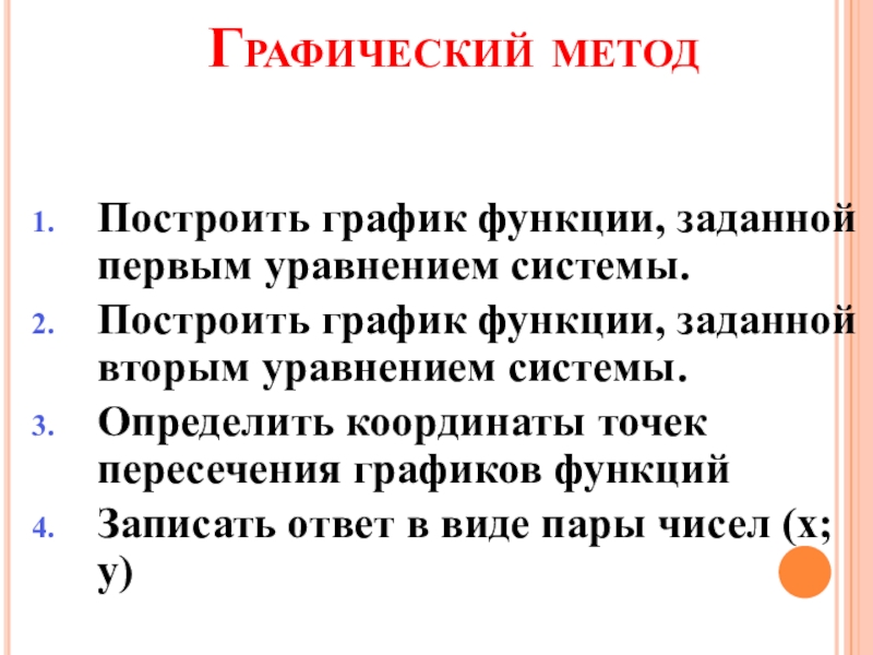Графический метод  Построить график функции, заданной первым уравнением системы.Построить график функции, заданной вторым уравнением системы.Определить координаты