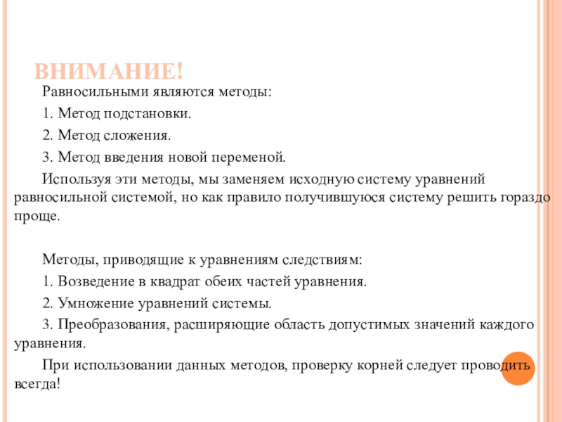 ВНИМАНИЕ!	Равносильными являются методы:	1. Метод подстановки.	2. Метод сложения.	3. Метод введения новой переменой.	Используя эти методы, мы заменяем исходную систему