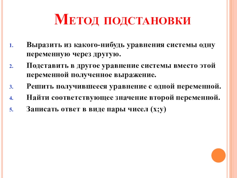 Метод подстановки Выразить из какого-нибудь уравнения системы одну переменную через другую.Подставить в другое уравнение системы вместо этой