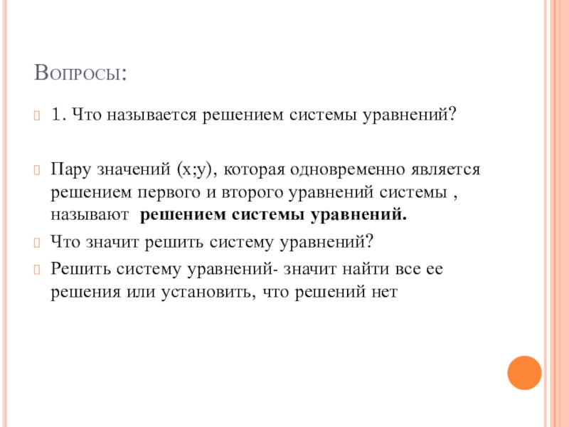 Вопросы:1. Что называется решением системы уравнений?Пару значений (х;у), которая одновременно является решением первого и второго уравнений системы