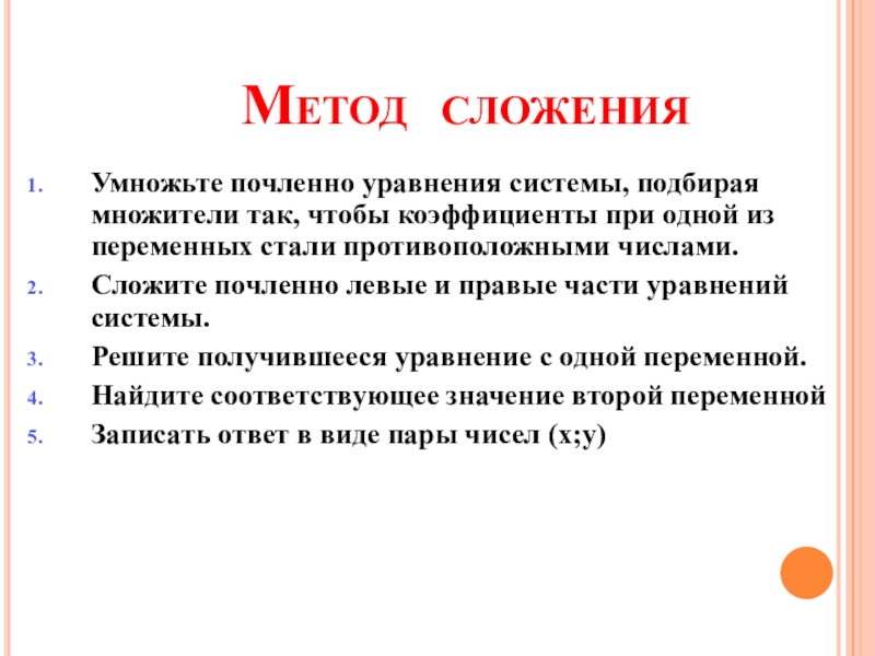 Метод сложенияУмножьте почленно уравнения системы, подбирая множители так, чтобы коэффициенты при одной из переменных стали противоположными числами.Сложите