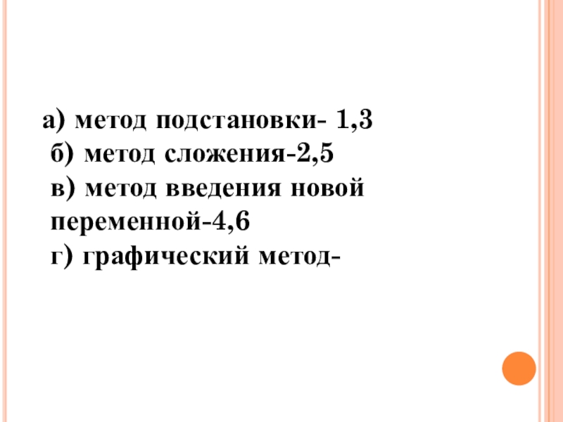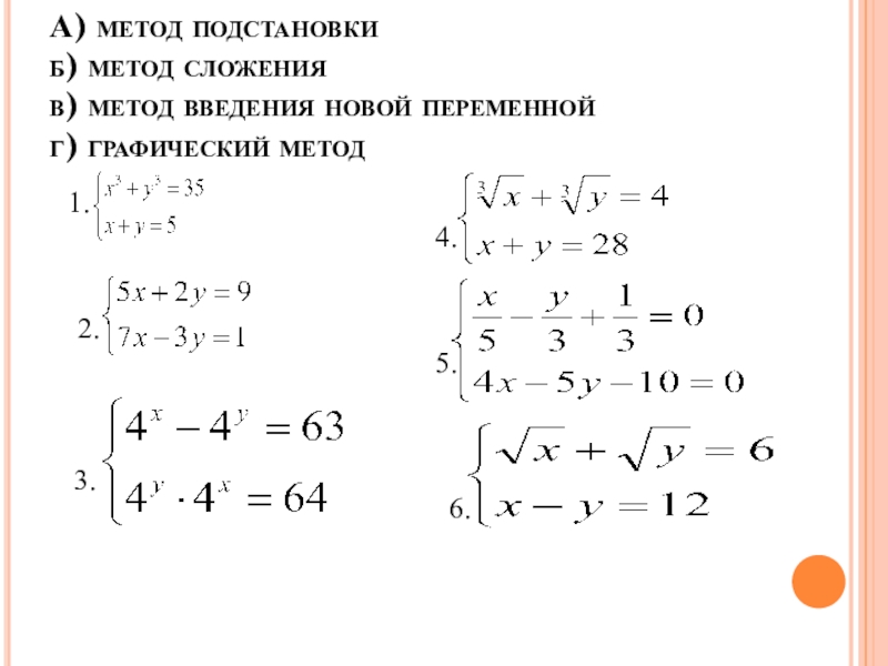 а) метод подстановки- 1,3 б) метод сложения-2,5 в) метод введения новой переменной-4,6 г) графический метод-