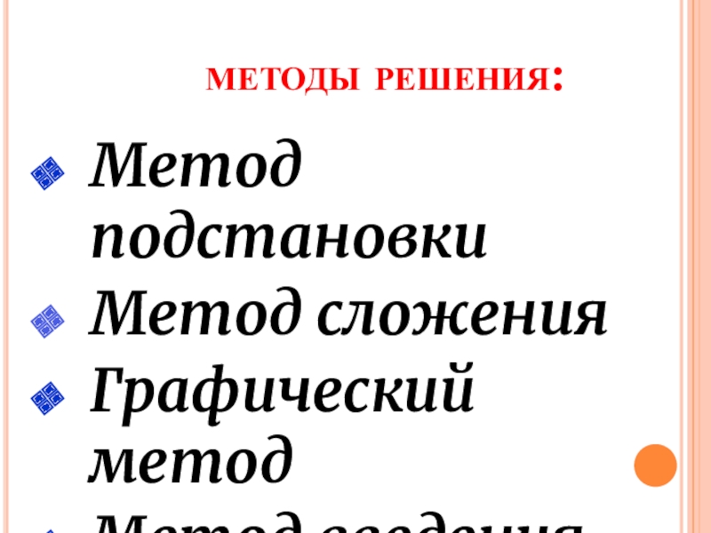 методы решения:Метод подстановкиМетод сложенияГрафический методМетод введения новой переменной
